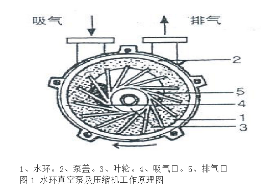 2BV型水環(huán)式真空泵如圖(1)所示葉輪3偏心地安裝在泵體之內(nèi),起動(dòng)時(shí)向泵內(nèi)注入一定高度的水,因此當(dāng)葉輪3旋轉(zhuǎn)時(shí),水受離心力的作用而在泵體內(nèi)壁形成一旋轉(zhuǎn)水環(huán)1,水環(huán)下部?jī)?nèi)表面與輪轂相切,沿箭頭方向旋轉(zhuǎn),在前半轉(zhuǎn)過(guò)程中,2BV型水環(huán)式真空泵水環(huán)內(nèi)表面逐漸與輪轂脫離,因此在葉輪葉片間與水環(huán)形成封閉空間,隨著葉輪的旋轉(zhuǎn),該空間逐漸擴(kuò)大,空間氣體壓力降低,氣體自圓盤(pán)吸氣口被吸入;在后半轉(zhuǎn)過(guò)程中,水環(huán)內(nèi)表面逐漸與輪轂靠近,葉片間的空間逐漸縮小,空間氣體壓力升高,高于排氣口壓力時(shí),葉片間的氣體自圓盤(pán)排氣口被排出。如此葉輪每轉(zhuǎn)動(dòng)一周,葉片間的空間吸排氣一次,許多空間不停地工作,2BV型水環(huán)式真空泵就連續(xù)不斷地抽吸或壓送氣體。