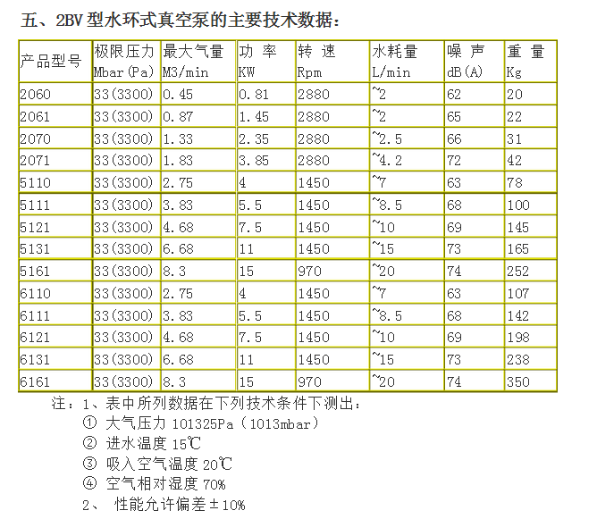 在2BV真空泵蓋上安裝有園盤(pán),園盤(pán)上設(shè)有吸、排氣孔和柔性排氣閥片,柔性閥片的作用是當(dāng)葉輪葉片間的氣體壓力達(dá)到排氣壓力時(shí),在排氣口以前就將氣體排出,減少了因氣體壓力過(guò)大而消耗的功率、從而降低率消耗。四、2BV型水環(huán)式真空泵的產(chǎn)品說(shuō)明: