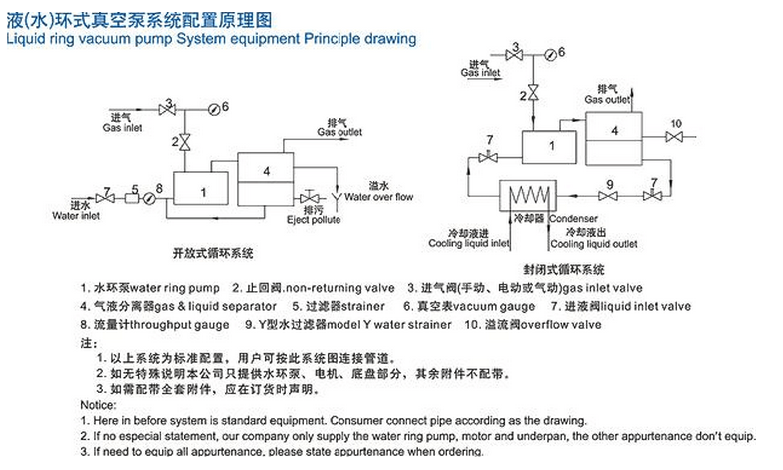 ●如排氣口壓強(qiáng)高于大氣壓而低于0.15MPa時(shí),可用真空泵改裝為液環(huán)壓縮機(jī)使用。 6、系統(tǒng)配置型式