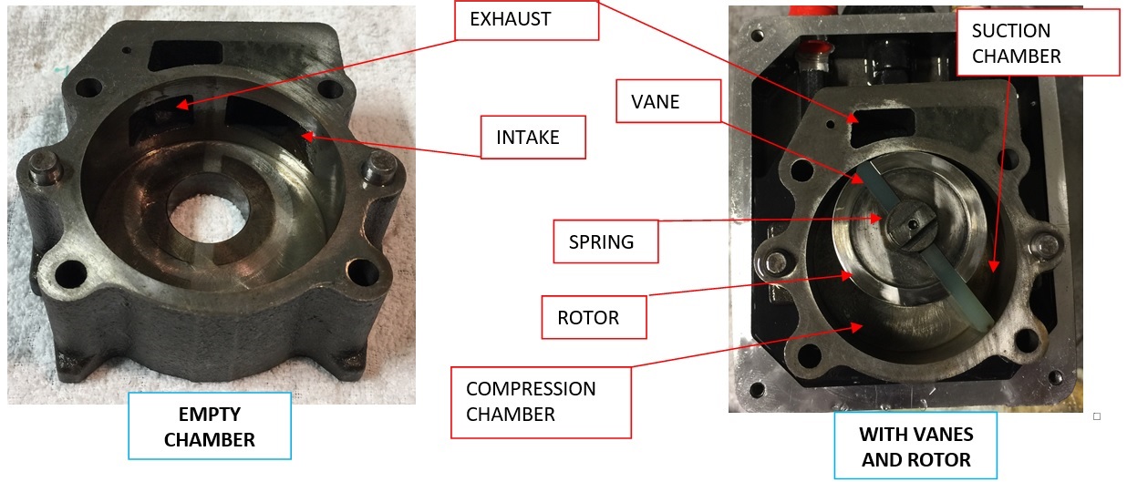 氣體進入吸氣腔,并立即被轉(zhuǎn)子的葉片壓縮。當(dāng)轉(zhuǎn)子旋轉(zhuǎn)時,它將氣體分子推向泵室,并朝向排氣,然后被排放到大氣中。